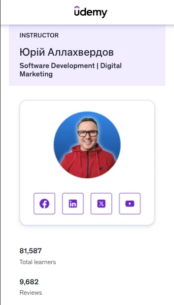 Маю більше 80 000 студентів на Udemy, працював з EdTech-напрямком, будував структури курсів, методичні матеріали та практичні навчальні продукти.